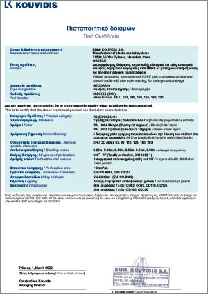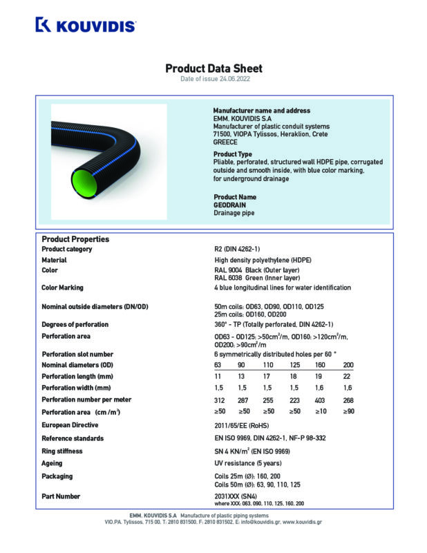 Conducta pliabil perforată GEODRAIN este produsă în colaci de 50m și 25m cu rigiditatea inelară de SN4. Are doi pereți, unul exterior ondulat și unul interior neted, structurați (îmbinați împreună) și perforați simetric la 3600. Peretele exterior este ondulat astfel încât să poată fi instalată mai ușor în funcție de morfologia solului, iar peretele interior este neted pentru a facilita curgerea apei. Greutatea mult mai mică facilitează încărcarea și transportul și este ușor de tăiat fără folosirea uneltelor. KOUVIDIS este singura companie 100% grecească ce a dezvoltat tehnologia perforării conductelor cu perete dublu structurat.