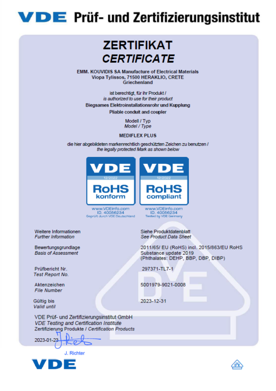 Conducta este produsă din PP termoplastic special stabilizat, fără halogen (EN 50642), fără metale grele (RoHS) și cu emanare redusă de fum (EN 61034-2). Prin urmare, este cea mai fiabilă și sigură soluție în caz de incendiu, îndeplinind totodată cerințele Regulamentului 364/2016/ΕΕ privind protecția împotriva incendiilor.