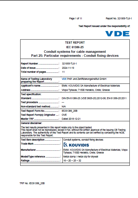 CLEMĂ METALICĂ KOUVIDIS -Rezultatele testului VDE