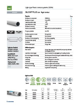 Conducta SILCOR PLUS cu 2 straturi este produsă din PO blend cu termoplastic special stabilizat, nu conține halogeni (EN 50642) și metale grele (RoHS), oferind în același timp emisii reduse de fum (EN 61034-2), ceea ce face din aceasta o soluție sigură și de încredere pentru instalațiile electrice, în caz de incendiu.